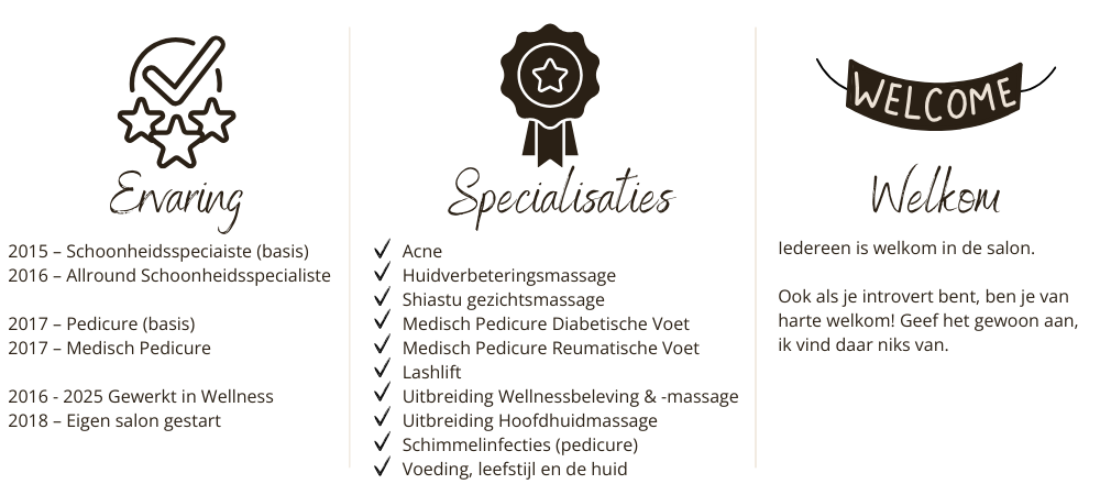 In de salon kom je echt even tot rust tijdens een ontspannende en holistische gezichtsbehandeling, neem ik de tijd om je wenkbrauwen weer bij te werken, geef ik je een opvallende oogopslag met een lashlift of zorg ik ervoor dat jij na een pedicurebehandeling weer op wolkjes naar buiten loopt.